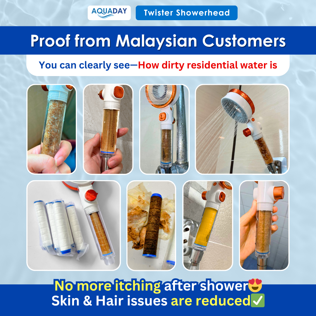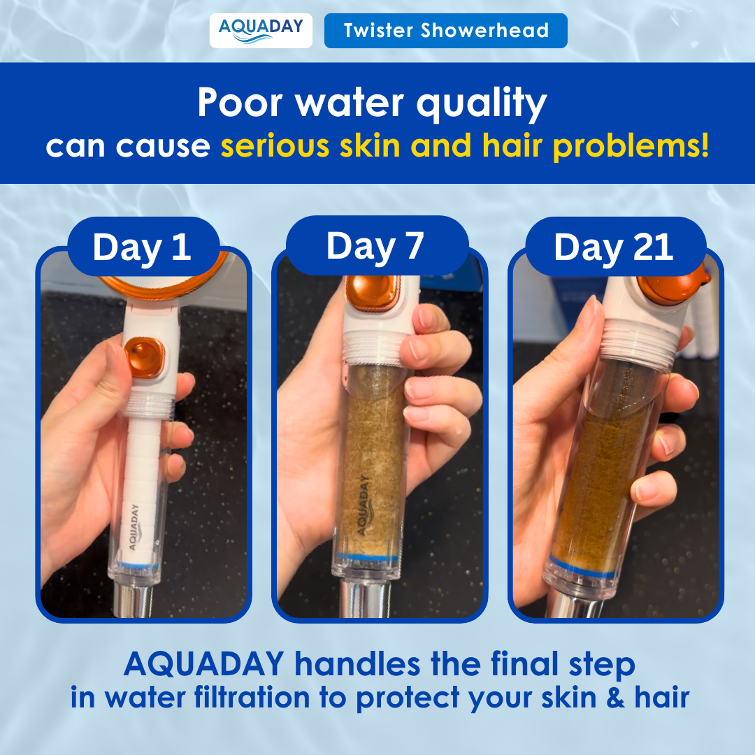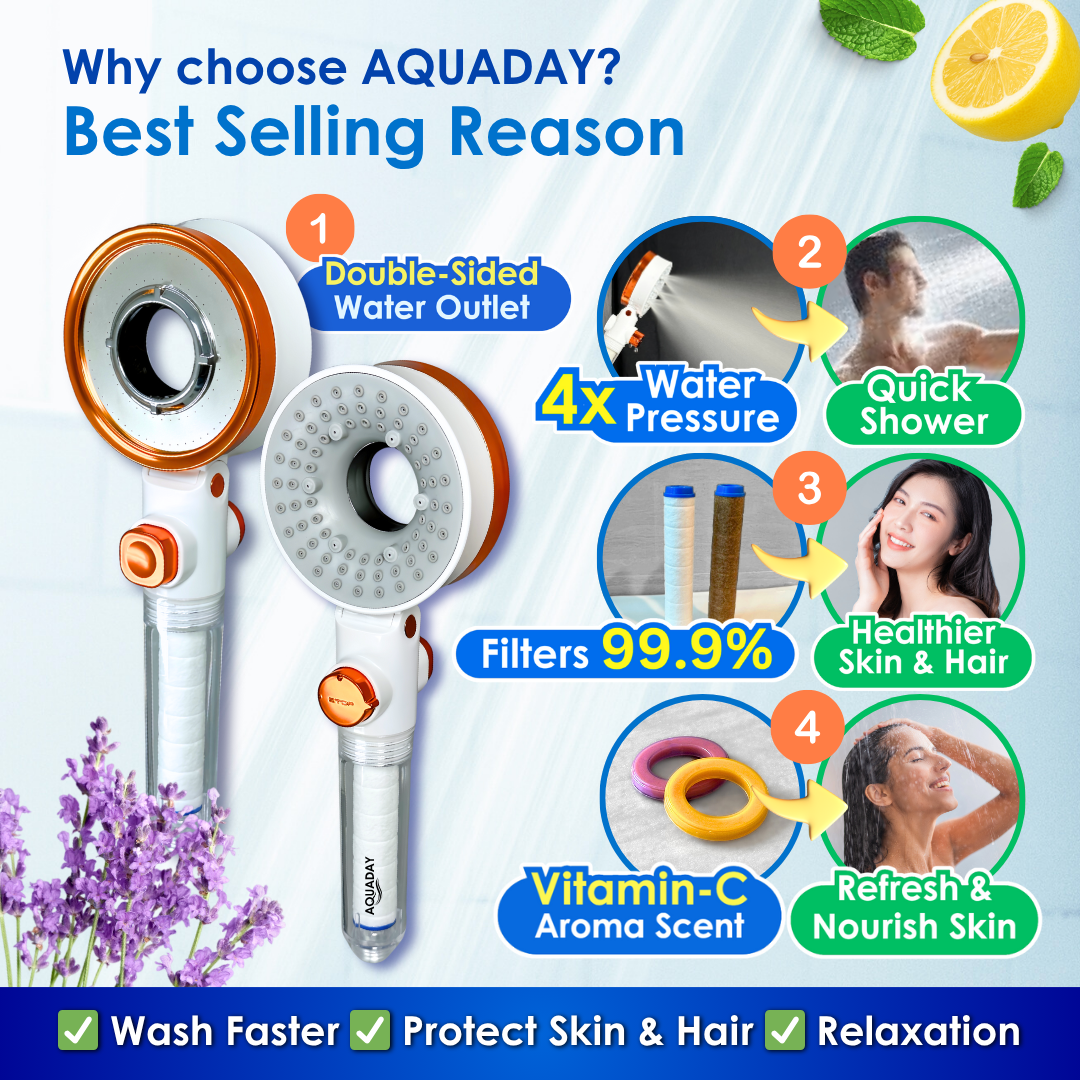 The water pressure is strong. No need to shower slowly anymore! With water filter, my husband’s skin doesn’t itch like before, and the water even smells great. We really enjoy using it. Thank you, Aquaday!
